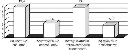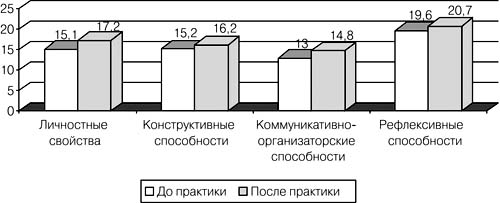 Рис. 2. Показатели прироста результатов по каждому блоку До прохождения педагогической практики выявлена значимая взаимосвязь (на 5%-ном уровне) между следующими показателями: экстра-интровертированностью и абстрактным мышлением (0,848); уверенностью в себе - тревожностью и реактивной тревожностью (0,837); экспрессивностью -сдержанностью и эмоциональной устойчивостью (0,852); жесткостью -чувствительностью и реактивной тревожностью (0,883); развитым воображением -практичностью и "Силой-Я" (0,844); тревожностью -уверенностью в себе и высоким самоконтролем-низким самоконтролем (0,835); способностью к рассуждению и конструктивным мышлением (0,965); "Силой-Я" и компромиссом (0,885); избеганием и соперничеством (0,934); речевым мышлением и компромиссом (0,852); дифференцированными эмоциями и соперничеством (0,934); высокой нормативностью поведения -подверженностью чувствам и подозрительностью -доверчивостью (0,844). После прохождения практики выявлена значимая взаимосвязь по следующим показателям: экстра-интровертированностью и расслабленностью (0,980); эмоциональной устойчивостью и озабоченностью -беспечностью (0,852); эмоциональной устойчивостью -неустойчивостью и речевым мышлением (0,863); робостью-смелостью и консерватизмом-радикализмом (0,842); доверчивостью-подозрительностью и ориентацией на себя (0,860); самоуверенностью -склонностью к чувству вины и зависимостью -независимостью (0,872); конструктивным мышлением и способностью к рассуждению (0,863); конструктивным мышлением и ориентацией на задачу (0,850); дифференцированными эмоциями и пространственным воображением (0,886). Таким образом, можно сделать вывод о существовании сильной взаимосвязи между отдельными способностями личности и уровнем профессиональной готовности. Выводы До начала педагогической практики у студентов преобладали личностные свойства и рефлексивные способности. После прохождения педагогической практики произошли изменения во всем четырех блоках ("Личностные качества", "Конструктивные способности", "Коммуникативно-организаторские способности", "Рефлексивные способности"), причем наиболее существенные - в первом и третьем. Выявлена существенная взаимосвязь между отдельными способностями личности и уровнем профессиональной готовности. Это доказывает, что педагогическая практика носит обучающий, развивающий и адаптивный характер. Литература 1. Виленский М.Я. Профессиональная направленность физического воспитания студентов педагогических специальностей / М.Я. Виленский, Р.С. Сафин. М., 1989, с.11-15. 2. Волков Н.Н. Моделирование личности, деятельности тренера и совершенствование физкультурного образования / Н.Н. Волков, В.С. Топчиян // Теория и практика физ. культуры. 1989, №10, с. 27-29. 3. Генов Ф. Психологические особенности мобилизационной готовности спортсменов. М., 1974, с. 37-39. 4. Иванова Е.М. Основы психологического изучения профессиональной деятельности. М., 1987, с. 40-43. 5. Каргаполов В.П. Социальная модель преподавателя физической культуры: Автореф. канд. дис. М., 1981, с. 11-13. 6. Корецкий В.М. Профессионально-педагогическая подготовка студентов физкультурных вузов в системе дисциплин "специализаций": Докт. дис. М., 1989, с. 9-11. 7. Маркова А.К. Психология труда учителя. М.,1993, с. 117-119. 8. Попова Н.В. Управленческая деятельность преподавателя физического воспитания вуза и формирование готовности к её выполнению у студентов И