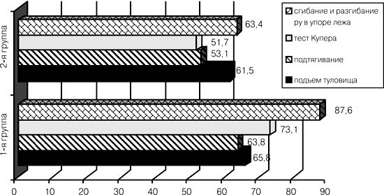 Относительные показатели двигательной подготовленности ветеранов спорта, % Так, результаты двигательной подготовленности у ветеранов спорта, отнесенных к 1-й группе, таковы: подъем туловища в сед - 65,8%; подтягивание на перекладине - 63,8%; тест Купера - 73,1%, сгибание и разгибание рук в упоре лежа - 87,6%. Во 2-й группе изменения соответственно равны: 61,5; 53,1; 51,7 и 63,4 % (р<0,05). Таким образом, занятия физическими упражнениями с определенной величиной ДА в целом повышают уровень функционального состояния и двигательной подготовленности ветеранов спорта. Заключение. Проведенные исследования позволяют утверждать, что оптимальная величина ДА оказывает существенное влияние на уровень функционального состояния и двигательную подготовленность ветеранов спорта. Эта категория людей способна поддерживать высокий уровень работоспособности в процессе жизнедеятельности. С учетом возрастных особенностей и состояния здоровья спортсменов-ветеранов в процессе занятий должен использоваться врачебно-педагогический контроль за функциональным и физическим состоянием. Литература 1. Анохин П.К. Узловые вопросы теории функциональной системы. - М.: Наука, 1980. - 197 с. 2. Гаврилов Д.Н., Романова Е.Е., Малинин А.В. Двигательная активность и долголетие: организационные и педагогические аспекты // Теория и практика физ. культуры. 1999, № 2, с. 9-12. 3. Гаврилов Д.Н., Комков А.Г., Малинин А.В. и др. Педагогические и организационные возможности двигательного режима людей зрелого и пожилого возраста // Теория и практика физ. культуры. 1999, № 6, с. 44-47. 4. Граевская Н.Д. Физическая культура, спорт и здоровье // Сб. науч. тр. М., 1983, с. 23-25. 5. Кардялис К., Мацюлявичене Э. Особенности физической активности людей среднего возраста и ее связь с социально-демографическими показателями // Матер. науч.-практ. конф. "Спорт для всех и здоровый образ жизни в ХХI веке". М., 2002, с. 240. 6. Коновалов В. Изучение адаптивных реакций организма спортсменов, специализирующихся в легкоатлетических видах на выносливость // Тез. докл. междунар. конгресса "Человек в мире спорта: новые идеи, технологии, перспективы". - М.: ФОН, 1998, с. 84. 7. Меерсон Ф.З., Пшенникова М.Г. Адаптация к стрессовым ситуациям и физическим нагрузкам. - М.: Медицина, 1986. - 256 с. 8. Роженов В.В., Полевщиков М.М. Индивидуализация контроля функционального состояния при занятиях физической культурой и спортом // Сб. "Спорт для всех и здоровый образ жизни в ХХI веке". М., 2002. 9. Устинов О.А., Вернер В.В., Никоненко В.Г. Физическая культура в зрелом возрасте. Омск, 1987. - 59 с. 10. Физическая культура, здоровье и трудовое долголетие советского человека // Сб. науч. тр. М., 1983. - 190 с.