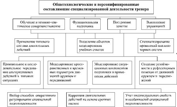 заслуженный тренер России Ю. М. Бычков Специализированная деятельность тренера (на примере видов спортивного фехтования) помимо ее методических составляющих отличается большим разнообразием двигательных действий, целенаправленно моделируемых с учетом персональных потребностей подготовки обучаемых (см. схему). Среди общетехнологических компонентов педагогической деятельности тренера на занятии фехтованием основная их часть относится к обучению и технико-тактическому совершенствованию, функциональной подготовке обучаемых, построению урока и проведению упражнений. Обучение и технико-тактическое совершенствование, оцениваемые применительно к занятию фехтованием, - это прежде всего его содержание, программируемое по возрастным этапам тренировки, уровню квалификации, продолжительности подготовки и соревновательному опыту, индивидуальным психофизиологическим характеристикам и тактическим особенностям ведения поединков обучаемыми. В содержание обучения и технико-тактического совершенствования фехтовальщиков включены: - специализированные положения, приемы передвижений; - специализированные движения оружием; - базовые действия наступления, обороны, подготовки, конкретизированные в разновидностях атак, защит с ответом, контрзащит с контрответом, контратак, комбинаций действий оружием и приемов передвижений; - тактические умения, специальные знания и тактические качества. Функциональная подготовка фехтовальщика направлена главным образом на специализирование проявлений психических и двигательных качеств, создание резервных возможностей для обеспечения надежности выступлений в главных календарных соревнованиях планируемых циклов тренировки. Построение занятия, и прежде всего выделение его направленности, предусматривает обучение новым приемам манипулирования оружием и выполнения передвижений, совершенствование базовых действий и тактических умений, повышение уровня овладения отдельными разделами техники и тактики, надежности применения действий наступления и обороны в тренировочных поединках и др. Цель выполнения упражнений (их форма и используемые методические приемы) - овладение маневрированием и сохранение заданной дистанции, произвольное и последовательное чередование избранных действий нападения, защиты, подготовки, предупреждение неадекватных реакций на финты, ложные батманы, подготавливающие сближения и нападения, и др. Реализация каждого из выделенных общетехнологических компонентов специализированной деятельности потребует от тренера на занятии фехтованием прежде всего моделирования двигательных параметров действий оружием и передвижений обучаемых, а затем и собственных избранных действий или предлагаемых партнеру. . К персонифицированным составляющим специализированной деятельности тренера и спортсмена на занятии фехтованием прежде всего относятся: - применение типового состава двигательных действий и их многократное повторение в избранных ситуациях поединков; - выделение объектов моделирования учебных схваток; - моделирование пространственных и временных параметров движений оружием, выполнение приемов передвижений и их соотношение с дистанционными и моментными особенностями противоборства с противником в поединке; - произвольное и последовательное чере