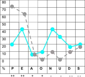 Рис.1. Профиль выраженности образа исходного и прогнозируемого состояния. Сплошная линия - исходное состояние; пунктирная - прогнозируемое состояние: P - психическое спокойствие; N - психическое напряжение; E - чувство силы и энергии; U - опасение, тревога; А - стремление к акции, к действию; D - депрессия, изнуренность; О - импульсивная реактивность; S - удрученность, подавленность