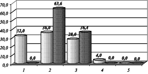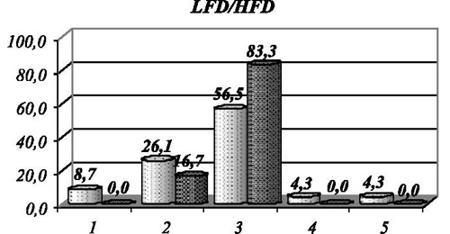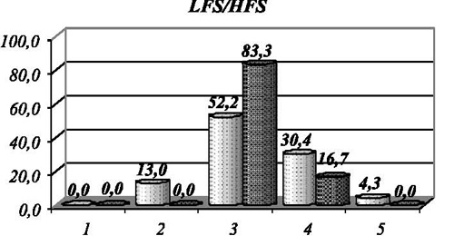 Рис. 5. Распределение спортсменов, занимающихся бегом и волейболом, по вегетативному тонусу регуляции систолического (LFS/HFS) и диастолического давления (LFD/HFD), где 1 отвечает выраженной парасимпатикотонии, 2 - умеренной парасимпатикотонии, 3 - эйтонии|, 4 - умеренной симпатикотонии, 5 - выраженной симпатикотонии Из рис. 5 видно, что распределение спортсменов в соответствии с преобладающим тонусом имеет свои особенности в первой и второй группах. Так, во второй из них вегетативный тонус предельно сбалансирован по систолическому и диастолическому давлению (в 83,3 % случаев - в границах нормативных значений). В первой группе это распределение напоминает популяционное с некоторым преобладанием парасимпатикотонии по диастолическому давлению. Обобщая полученные результаты, следует отметить, что в каждой из исследуемых групп есть некоторые особенности вегетативного обеспечения кардиореспираторной системы, которые, на наш взгляд, связаны как с общим влиянием занятий спортом, так и с особенностями конкретных видов, имеющих различную направленность тренировочного процесса. Рис. 4. Распределение спортсменов, занимающихся бегом и волейболом, по уровню вегетативного обеспечения систолического (TPS) и диастолического (TPD) давления Рис. 5. Распределение спортсменов, занимающихся бегом и волейболом, по вегетативному тонусу регуляции систолического (LFS/HFS) и диастолического давления (LFD/HFD), где 1 отвечает выраженной парасимпатикотонии, 2 - умеренной парасимпатикотонии, 3 - эйтонии, 4 - умеренной симпатикотонии, 5 - выраженной симпатикотонии Литература 1. Баевский Р.М., Берсенева А.П. Оценка адаптационных возможностей организма и риска развития заболеваний. М., 1997. - 200 с. 2. Вегетативные расстройства: клиника, лечение, диагностика / Под ред. А. М. Вейна. - М.: Медицина, 2000. - 752 с. 3. Гены-маркеры предрасположенности к скоростно-силовым видам спорта // В.А. Рогозкин, И.В. Астратенкова, А.М. Дружевская, О.Н. Федоровская // Теория и практика физ. культуры. 2005, № 1, с. 3-8. 4. Дубровский В.И. Спортивная медицина. - М.: Владос, 1999. - 480 с. 5. Земцовский Э.С. Спортивная кардиология. - СПб.: Гиппократ. - 420 с. 6. Комаров Г.Д., Кучма В.Р., Носкин Л.А. Полисистемный саногенетический мониторинг. - М.: МИПКРО, 2001. - 343 с. 7. Мирзоев О.М. Применение восстановительных средств в спорте. - М.: СпортАкадемПресс, 2000. 8. Паненко А.В., Романчук О.П. До питання нормування результатів дослідження варіабельності артеріального риску // Одеський медичний журнал. 2003, № 2, с. 66-67. 9. Романчук А.П. Вегетативная регуляция кардиореспираторной системы в динамике годичного тренировочного цикла // Теория и практика физ. культуры. 2005, № 6, с. 42-45. 10. Романчук А.П. Особенности вегетативного обеспечения кардиореспираторной системы футболистов в годичном тренировочном цикле // Вестник спортивной науки. 2005, № 1 (6), с. 29-32. 11. Уилмор Дж.Х., Костилл Д.Л. Физиология спорта и двигательной активности. - Киев: Олимпийская литература, 1997. - 456 c. 12. Heart rate and blood pressure variability in obese normotensive subjects. / Piccirillo G., Vetta F., Viola E., Santagada E., Ronzoni S., Cacciafesta M., Marigliano V. // Int J Obes Relat Metab Disord 1998 Aug;22(8):741-750. 13. Kikuya M., Hozawa A., Ohokubo T. et. al. Prognostic significance of blood pressure and heart rate variabilities: the ohasama study. - Hypertension 2000 Nov; 36(5): 901-6.