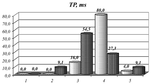 Рис. 1. Особенности распределения показателей ЧСС у обследованных спортсменов, занимающихся бегом (светлые столбцы) и волейболом (темные столбцы) по ранговым параметрам, где по оси абсцисс - ранг, а по оси ординат - процент Сравнивая данные этого распределения у спортсменов с различной направленностью тренировочного цикла, необходимо отметить, что при его циклической направленности ЧСС в покое значительно меньше, чем при ациклической, что в целом подтверждает данные многих авторов [1, 5, 11]. Хотя при ациклической направленности (занятия волейболом) отмечается достаточно выраженная тенденция к урежению ЧСС в сравнении с популяционными данными. Достаточно информативными были параметры, характеризующие вегетативное обеспечение сердечного ритма, используемые многими авторами для прогнозирования функционального состояния организма и характеристики адаптационных резервов (по показателю ТР, ms), а также уровень вегетативного тонуса в регуляции сердечного ритма (по показателю Malik - LF/HF), который свидетельствует о преобладании активности вегетативных ветвей (симпатической и парасимпатической) в регуляции ритма сердца. Все эти параметры исследовались в соответствии со стандартами Международной ассоциации кардиологов (рис. 2).