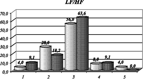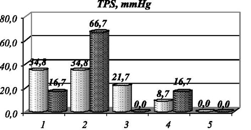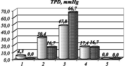 Рис. 3. Распределение спортсменов, занимающихся бегом и волейболом, по вегетативному тонусу регуляции ритма сердца (LF/HF), где 1 отвечает выраженной парасимпатикотонии, 2 - умеренной парасимпатикотонии, 3 - эйтонии, 4 - умеренной симпатикотонии, 5 - выраженной симпатикотонии Из рис. 3 видно, что в исходном состоянии показатели вегетативного тонуса в регуляции сердечного ритма в первой и второй группах практически отвечают популяционным. Обращает на себя внимание почти одинаковое распределение этих параметров с умеренным сдвигом в сторону парасимпатикотонии, что свидетельствует об экономизации функции сердечного ритма. Сдвиги в сторону симпатикотонии по встречаемости не значительны: в первой группе - в 12 % случаев, во второй - в 9,1 % случаев. При этом во второй группе отсутствуют варианты выраженной симпатикотонии. Такой вариант распределения в обеих группах свидетельствует о более выраженной экономизации сердечной деятельности у спортсменов по сравнению с популяцией, с одной стороны, а с другой - в беговых дисциплинах направленность процессов восстановления в состоянии покоя более выраженна, что может свидетельствовать о разных механизмах восстановления в исследованных группах. Не менее информативными выглядят данные, полученные при анализе параметров вегетативного обеспечения (по параметрам ТРS mmHg и TPD mmHg) и вегетативного тонуса в регуляции (по параметрам LFS/HFS и LFD/HFD) систолического и диастолического артериального давления соответственно (рис. 4).